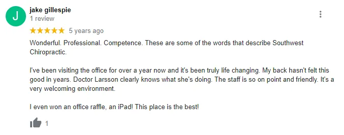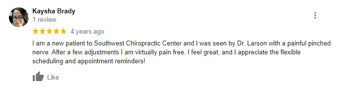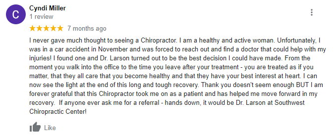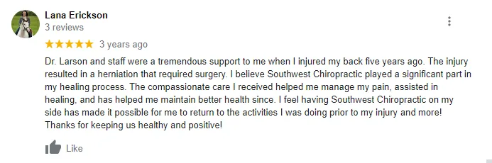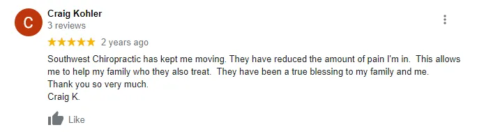 Disclaimer: Procedures and treatments performed by Southwest Chiropractic Center have an inherent success (and failure) rate. Reviews, testimonials and content on this site should not be interpreted as a statement of efficacy of procedures and treatments performed by Southwest Chiropractic Center for anyone else.